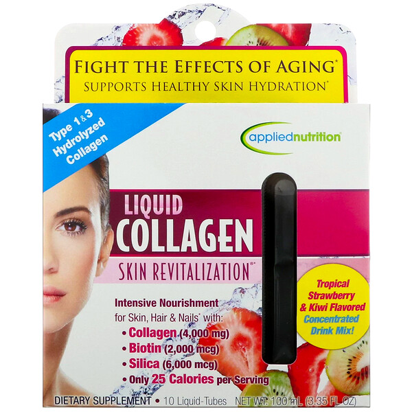 Fight the Effects of AgingSupports Healthy Skin HydrationType 1 & 3 Hydrolyzed CollagenAppliednutritionTropical Strawberry & Kiwi Flavored Concentrated Drink Mix! Dietary Supplement Intensive Nourishment for Skin, Hair & Nails with:Collagen (4, 000 mg)Biotin (2, 000 mcg)Silica (6, 000 mcg)Only 25 Calories per ServingCollagen – the secret to youthful-looking skin!Collagen may be the most important element of human skin. This complex protein makes up nearly 80% of skin and provides structure, elasticity and protection, while helping to retain moisture within the deep dermal layers. As aging occurs, collagen naturally decreases over time. Sooner or later, the reduction of collagen causes skin to become thinner, drier and more fragile. Loss of collagen is believed to be the primary cause of fine lines and wrinkles that occur in naturally-aged skin. Liquid Collagen Skin Revitalization®This truly unique and innovative product is specially designed to supply a full 4, 000 mg of hydrolyzed collagen (type I & III) along with the Antioxidant Blend, a broad spectrum of botanicals with antioxidant activity, and nutrients such as Biotin & Silica. Simply mix one concentrated Liquid-Tube into 16 ounces of water per day. Key ingredients include:Hydrolyzed Collagen: a full 4, 000 mg to help replenish the body’s supply of collagen. Biotin: the essential super beauty nutrient. Horsetail: nutrient-dense botanical and natural source of silica. Antioxidant Blend: a combination of super fruits and green tea extract to help protect skin from the damaging effects of free-radicals. Applied Nutrition® is committed to developing science-based products that exceed the highest standards for quality and purity. As a leader in innovation, we continuously strive to bring forward new ideas and groundbreaking formulas that enhance health and well-being.