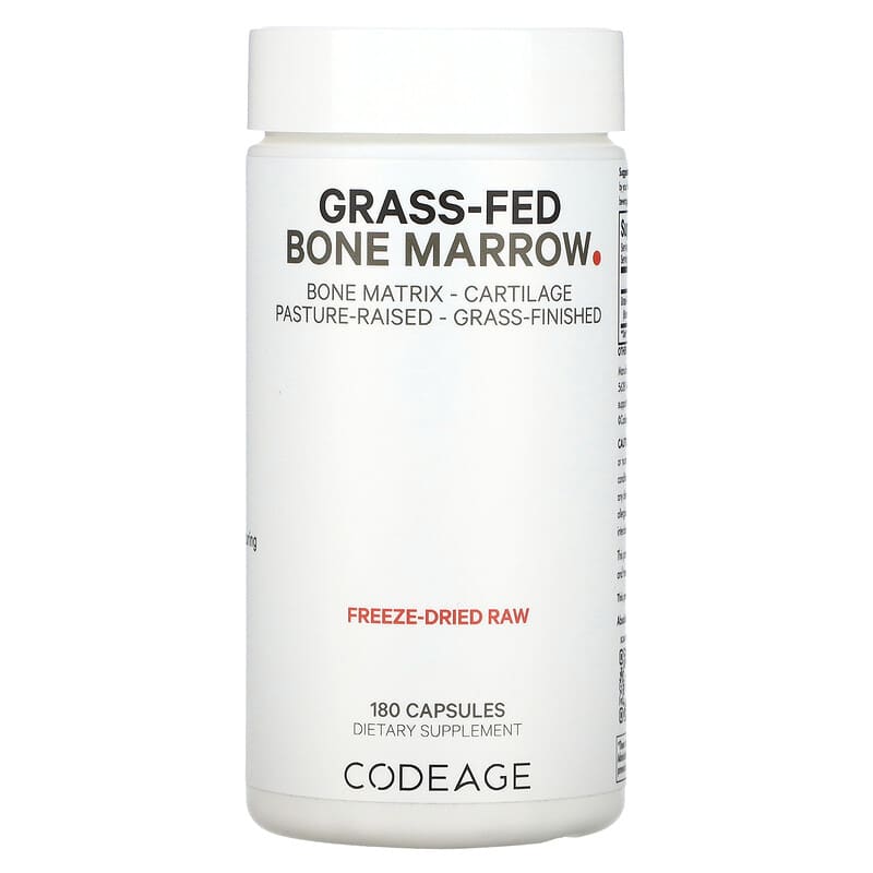 - Trên nhãn của mỗi sản phẩm (hộp, vỏ hộp) Codeage Grass-Fed Bone Marrow 180 Capsules có ghi thông tin hướng dẫn cách sử dụng bao gồm liều dùng và cách dùng. Tuy nhiên bạn nên hỏi ý kiến của Bác sĩ hoặc chuyên gia dinh dưỡng trước khi sử dụng.