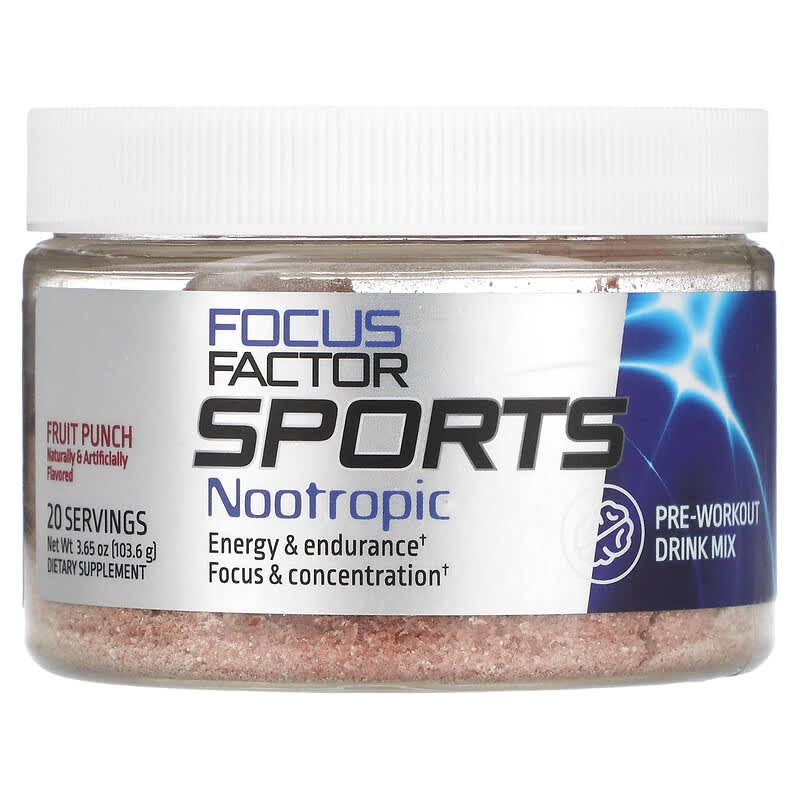 Naturally & Artificially Flavored20 Servings Dietary Supplement Energy & EnduranceFocus & ConcentrationFocus Factor Sports Nootropic is unlike standard pre-workout formulas in that it combines an energy and endurance blend featuring ingredients like beta alanine, citrulline, arginine (AAKG) & caffeine with a powerful nootropic blend including ginkgo & L-theanine for intense focus and attention. This 2-in-1 formulation was developed to provide that extra edge to maintain your focus while powering through tough workouts. So if you want to perform at your best, try Focus Factor Sports Nootropic.