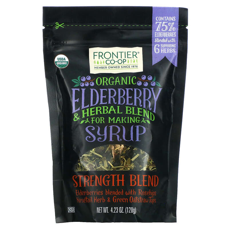 - Để Frontier Co-op Organic Elderberry & Herbal Blend For Making Syrup Strength Blend 4.23 oz (120 g) xa tầm tay trẻ em, ngay cả khi đã cất vào hộp chứa có nắp đậy kín. Lưu ý: Tất cả các vitamin và thực phẩm chức năng Frontier Co-op cho người lớn đều có thể gây hại nếu trẻ nhỏ sử dụng quá liều.