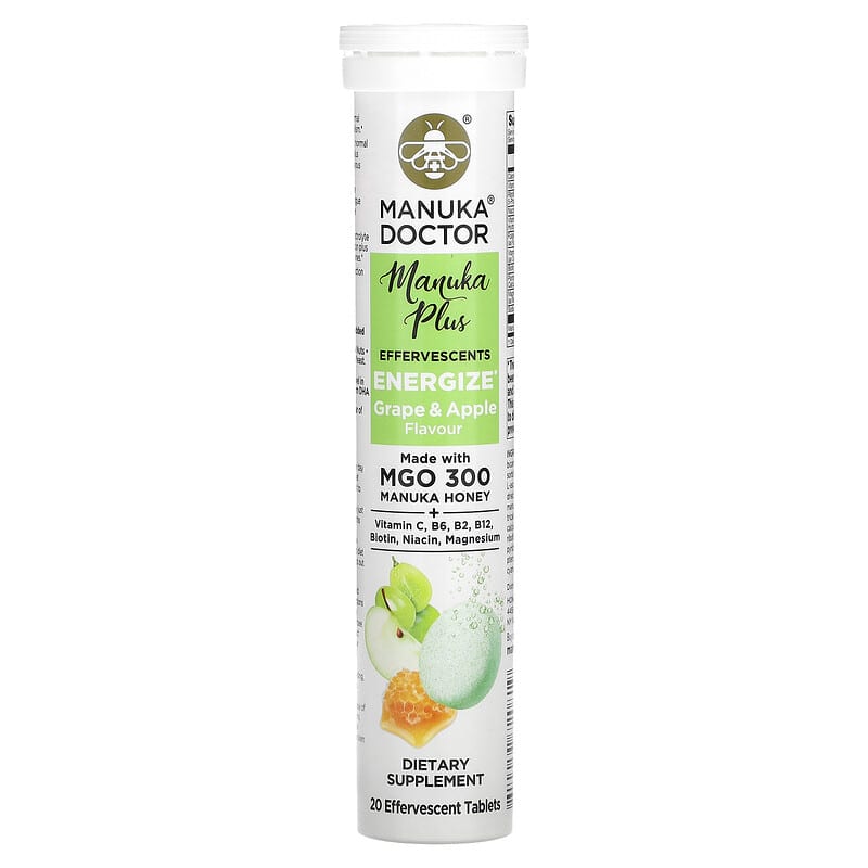- Để Manuka Doctor Manuka Plus Effervescents Energize Grape & Apple 20 Effervescent Tablets xa tầm tay trẻ em, ngay cả khi đã cất vào hộp chứa có nắp đậy kín. Lưu ý: Tất cả các vitamin và thực phẩm chức năng Manuka Doctor cho người lớn đều có thể gây hại nếu trẻ nhỏ sử dụng quá liều.