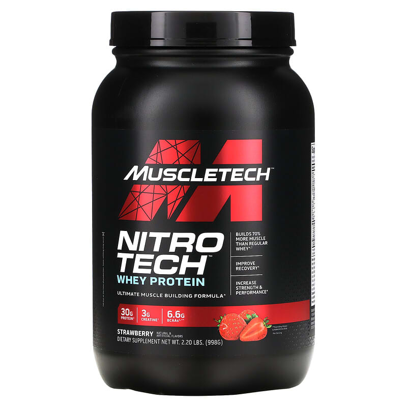 Builds 70% More Muscle Than Regular WheyImprove RecoveryIncrease Strength & PerformanceUltimate Muscle Building Formula30 g Protein‡3 g Creatine‡6. 6 g BCAAs‡**Natural & Artificial Flavors Dietary Supplement The Ultimate Whey Protein + Muscle Building FormulaFor 25 years, our groundbreaking Nitro-Tech® formula has taken on all challengers – and is still recognized as one of the most powerful proteins ever developed. Nitro-Tech® is our best-in-class, scientifically engineered whey protein formula, enhanced with the most studied form of creatine for more lean muscle, more strength, and better performance. This is the original for a reason – and proof that we relentlessly push the limits of science and research every day. Looking to take it to the next level? No matter what you do, Nitro-Tech® will help you get there. ^Go Beyond The Norm – 70% Better Than Regular WheyNitro-Tech® is the culmination of decades spent obsessing over formulations, acquiring patents, and funding research – and the work’s paid off. ‘In a 6-week, double-blind study, subjects using the core ingredients in Nitro-Tech®, with at least 3 years of weight training experience, gained 70% more lean muscle than those using regular whey protein (8. 8 vs. 5. 1 lbs. ), and their bench press increased more than subjects using regular whey protein (34 vs. 14 lbs. ). More lean muscle and strength means you get to that next level. Powerful Protein That DeliversIt’s clean and simple – and it delivers. A single scoop of Nitro-Tech® contains 30g of premium quality whey protein delivering essential and branched chain amino acids. It’s filtered using Multi-Phase Filtration Technology to remove unwanted carbs and fat. After all, what’s inside counts. Flavor Satisfaction GuaranteedFor years, the MuscleTech® brand has partnered with the world’s top flavor houses to deliver a delightful taste experience in every scoop of Nitro-Tech®. So, when your goals are so close that you can taste’em, drink up. You’re guaranteed to love it. **From Whey Protein & Added Amino Acids‡Per Serving