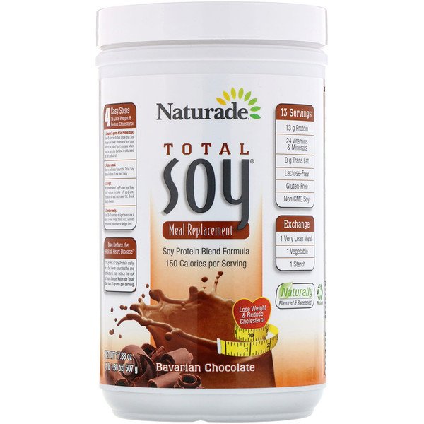 Soy Protein Blend Formula150 Calories Per ServingNaturally Flavored & SweetenedQuality Assured Purity3 Easy Steps to Lose WeightReplace a meal. Have a delicious Naturade Total Soy shake in place of one meal daily. Eat right. Increase intake of healthy whole foods options and fiber but reduce intake of sodium, cholesterol, and saturated fat. Drink plenty of water. Exercise weekly. Just 30-60 minutes of light exercise 4 days a week helps to enhance weight loss. 13 Servings13 g Protein24 Vitamins & Minerals0 g Trans FatLactose-FreeGluten-FreeNon-GMO SoyExchange1 Very Lean Meat1 Vegetable1 StarchReplace a Meal and Lose WeightTotal Soy can help you lose weight. Have a delicious Naturade Total Soy shake in place of one meal daily. This tasty shake provides all the nutrition of a complete meal, low in fat and cholesterol, with only 150 calories per serving so you can replace one meal a day and cut calories. Reducing weight can be beneficial to your health. Just follow our 3 Easy Steps plan. Total Soy is great as a quick breakfast or as a meal on-the-go. When you’re on a busy schedule, healthy eating can be a challenge. With Total Soy you just add water to make a satisfying, delicious weight loss shake in seconds. Naturade Total Soy is made with premium Soy Protein for proven health benefits and great taste. So you can be sure that you’re getting all the essential amino acids plus naturally occurring isoflavones. Below is a typical range of total isoflavones per serving followed by the approximate average of each component: Total Isoflavones: 13-39 mg (Genistein 9 mg; Daidzein 14 mg; Glycitein 3 mg)