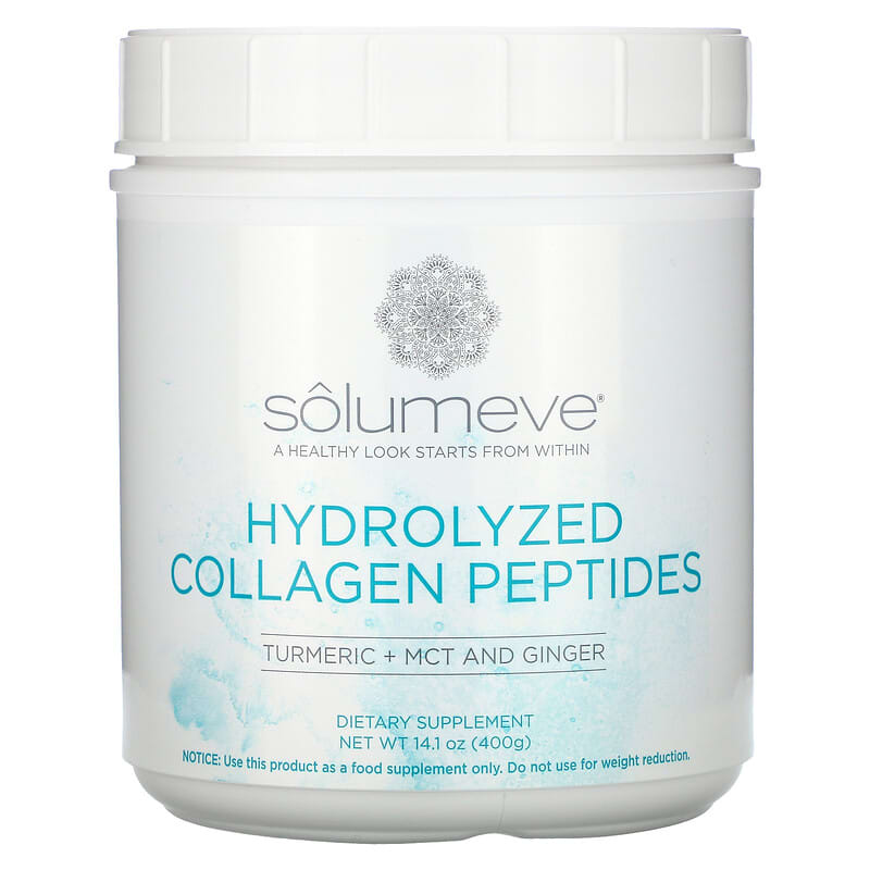 - Để Solumeve Hydrolyzed Collagen Peptides with Turmeric MCT and Ginger 14 oz (400 g) xa tầm tay trẻ em, ngay cả khi đã cất vào hộp chứa có nắp đậy kín. Lưu ý: Tất cả các vitamin và thực phẩm chức năng Solumeve cho người lớn đều có thể gây hại nếu trẻ nhỏ sử dụng quá liều.