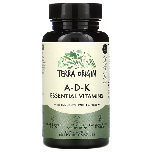 Non GMOGluten FreeVeganHigh-Potency Liquid CapsulesBone & Immune HealthCalcium AbsorptionCardiovascular Support Dietary Supplement For Bone, Heart & Immune HealthSpecially formulated using high-quality nutraceuticals, Terra Origin A-D-K Essential Vitamins are a vegan, non-GMO daily supplement that strengthens and supports your bones, heart and immune system. This high-potency blend of Vitamins A, D and K are packed in a MCT Oil liquid capsule to help generate cell production, absorb calcium from the bloodstream into the bone, strengthen bone density and provide cardiovascular support. Benefits Supports bone structure, density & integrityIncreases calcium absorptionPromotes a strong immune systemProvides cardiovascular supportFat-soluble vitamins with MCT Oil for maximum absorption