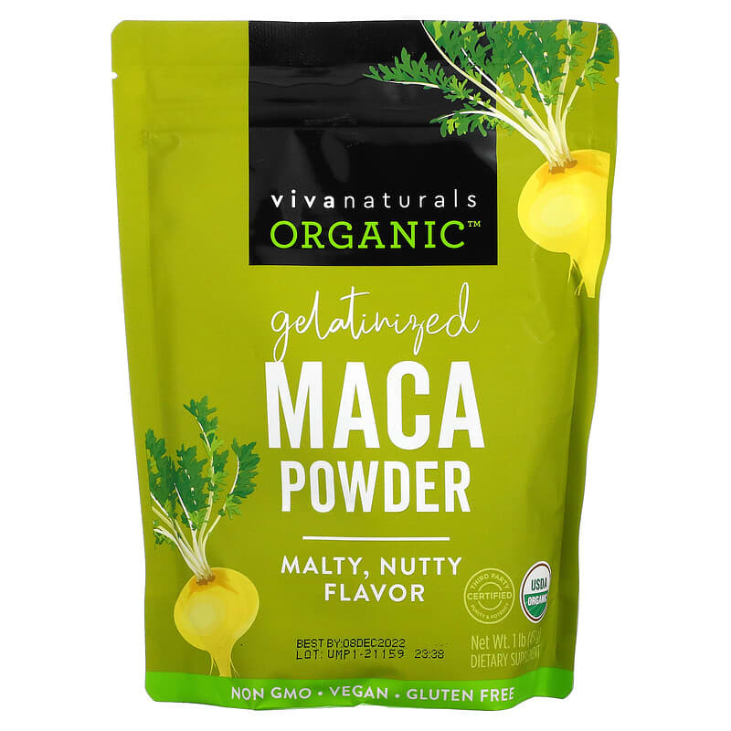 Malty, Nutty FlavorThird Party Certified Purity & PotencyUSDA OrganicNon GMO Project VerifiedVeganCertified Gluten FreeCertified Organic by QAICertified PaleoKosherWe Make Wellness Possible™A centuries-old super root used in traditional plant-based medicine, maca can support everything from hormonal health, to energy and endurance. Grown in the lush Andean mountains of Peru, Viva Naturals Organic Maca Powder is gelatinized, finely milled into a more tummy-friendly form than the raw variety. Use it to add earthy, toasted flavor to your favorite foods and drinks.
